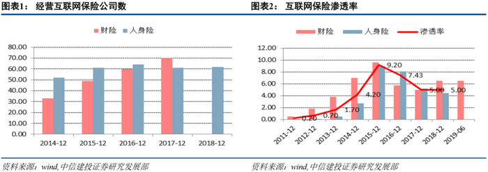 2011-2015年期间互联网保险行业经历了爆发式增长阶段,保费增速一度达到170%以上,经营互联网保险的公司数在2016年达到最高总计124家,保费收入在2016年最多达到2299亿元,占总保费收入的比例最高为9.2%。后随着2016-2017年间商车费改的大力推行以及理财型产品监管政策的收紧,导致互联网渠道销售产品优势趋弱,加之监管对于互联网保险乱象加大整治力度,使得互联网保险销售进入调整期。其中财产险互联网化的程度要高于人身险,主要由于财产险相对数据获取影响因素较少,可量化程度高,场景化程度强,并且一年期的短期产品,风险相对容易控制,更加容易适应数字化转型。