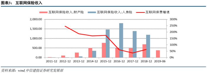 2018年互联网财险销售出现回暖迹象,占总财产险保费比例从5%上升到6.5%。一方面是车险业务有所回暖,另一方面是非车险业务的加速扩张,2018年互联网非车险业务在互联网财产险中占比接近50%,主要得益于更多的产品场景出现以及短期意外健康险的高增长。2019年上半年,共计71家财产保险公司开展互联网保险业务,互联网财产保险保费收入共381.53亿元,同比增长16.89%,高出全渠道财产保险市场5.57个百分点。(数据来源于保险行业协会)