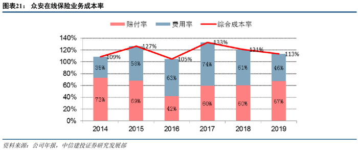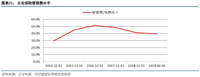 众安短期的目标是追求承保盈亏平衡,在控制综合成本率方面采取的主要措施,一方面通过提高业务质量来降低赔付率,例如大力发展个人健康险业务,降低出现率较高的团体健康险业务。另一方面主要体现在降低费用率上,渠道费用2019年已经体现出大幅改善,得益于高费用率的航旅业务规模的压缩,之后还会通过提升自有平台销售占比,来降低支付给其他平台费用的比例;后台费用率的下降要依靠保费规模增长来带动规模效应摊薄成本,而科技技术手段所带来的智能化与自动化能够帮助公司更好的实现规模效应、降低成本。