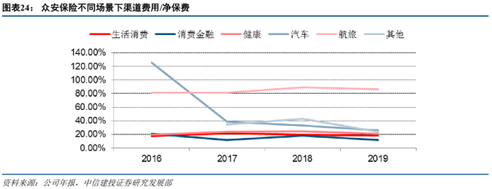 从综合成本率来看,众安保险综合成本率均超过100%,尚未实现承保盈利,但2017年以来已开始好转,主要来自于费用率降低的贡献。受益于有质量的增长以及科技驱动的降本增效,2019年公司综合成本率从120.9%降至113.3%,同比改善7.6个百分点,其中赔付率上升7.5pt.至67.4%,费用率下降15.1pt.至45.9%。公司承保亏损收窄至16.988亿元,同比减少7.4%。与传统龙头财险公司相比,众安在线的赔付率处于合理范围内,平均高于平安财险低于人保财险,但是费用率相对较高,主要由于公司尚处于成长阶段,一方面需要持续投入广告开支、手续费支出等费用以获取更多客户流量,另一方面针对后台费用尚未体现出明显的规模效应。公司在加大自有平台的销售,与更小的生态系统合作伙伴合作销售以控制成本,对手续费佣金以及技术服务费的成本控制也显现出一定的成效。从不同场景来分析,主要是航旅生态渠道费用偏高,渠道费用/净保费比例达到80%以上,其他场景该比例都在40%以下。