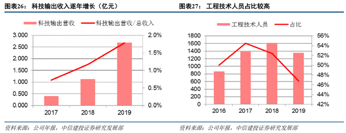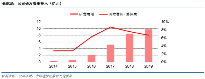 公司在研发方面的投入力度较大,2018年、2019研发费用投入分别为8.521亿元/9.769亿元,占总保费比例分别为7.57%/6.70%;公司工程技术人员截至2019年年末,总计1355人,占总人数比例为46.8%,公司科技输出营业收入逐年增长,2019年实现2.697亿收入,同比提升139.9%,占总营业收入的比例上升到1.8%。科技对外输出的收费模式包括产品授权收费、按定制化服务收费以及SaaS模式收取技术服务费。