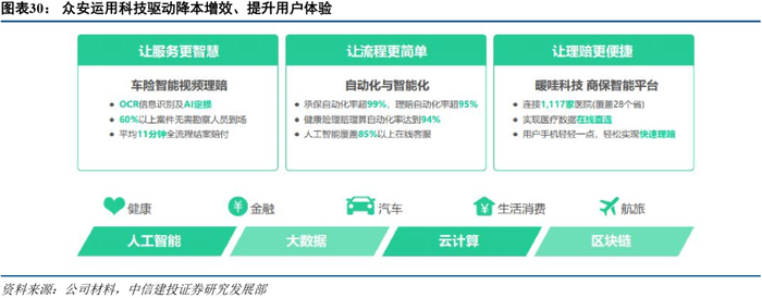优化投保全流程体验。传统保险领域存在着产品同质化、创新不足的现象,产品的设计与定价基本是从保险公司出发再到消费者,保险条款晦涩难懂、理赔体验较差;而互联网思维更加强调以客户需求为中心,众安保险通过互联网覆盖大量碎片化的场景,满足特定人群、垂直场景的差异化保障需求,更加贴近消费者,并借助大数据、人工智能、区块链等科技技术对风险进行更加精确的预测和估计,从而进行更精准的产品定价和更有效的风险控制。其次,借助科技技术,可以有效提升投保全流程体验,例如使用智能客服、智能保顾介入到售前保险咨询、保险顾问,使用智能核保使投保核保环节更加便捷顺畅、使用电子化保单、云存储、在线续保、退保的技术来提升效率,在核赔理赔环节简化理赔程序、提升理赔效率,整体提升用户购买保险的体验,从而增强公司竞争力。