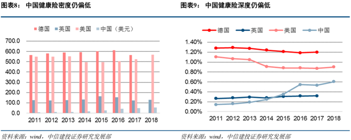 我国健康险深度、密度相对美国、德国、中国台湾等发达地区仍处于低水平,因此从渗透率上来看健康险增量空间巨大,但除了渗透率之外,我们还需要从居民支付能力的角度来看健康险发展空间,从人均卫生费/人均可支配收入,中国与德国接近均处于15%左右的水平,美国相对较高在20%以上,我们预期中国这一比例还将继续增长,另外我国人均可支配收入的增长速度是要明显高于对比发达国家的,因此随着人居可支配收入的增长,保险消费也会相应的增长;因此无论从渗透率角度还是从支付能力的角度来看,我国健康险保费增长空间仍然比较充裕。
