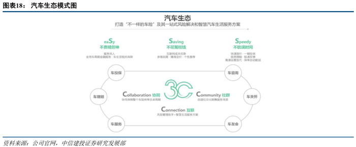 汽车生态主要就车辆损坏、人身伤亡及车辆失窃提供保险产品、解决方案以及增值服务,2015年与平安保险联合推出保骉车险,采取共保模式按照5-5分摊保费、赔付及成本,平安产险利用其广泛的线下资源提供无差别理赔服务。2019年“车点通”平台上线,为车险提供一站式精细化经营管控,系统最快能在1秒输出分析结果。此外,“马上赔2.0”上线,最快结案时间仅需10分钟。5月,车险板块在蚂蚁保险上线,半年内在蚂蚁保险平台的共保保费超过5亿。