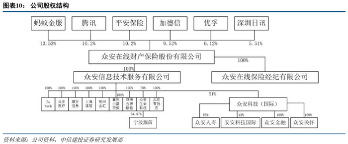 首家互联网保险公司,股东资源丰厚。公司成立于2013年,由九名股东发起设立,其中蚂蚁金服、腾讯、平安保险等互联网及保险行业巨头赫然在列,公司初始注册资本10亿元,2015年、2018年经过两次增资,注册资本达到14.70亿元。2017年9月于香港联交所上市,持股5%以上股东合计持股占比55.08%,前三大股东持股比例非别为蚂蚁金服13.53%、腾讯科技10.2%、平安保险10.2%。众安是中国首家取得保险法人许可的互联网公司,2014年于双十一购物节售出保单总数连创纪录约1亿份,2015年5月获批经营车险,并将“保险信息服务”纳入许可业务范围,2015年11月发布首个互联网至线下车险及保养品牌“保骉车险”,2016年4月发布“保贝计划”,利用技术和风控能力将消费金融平台与金融机构合作伙伴连接起来, 8月发布医疗保险产品“尊享e生”,11月发布“众安科技”品牌旨在支持保险行业技术升级和发展区块链、人工智能及其他新技术在保险行业的应用。众安信息技术服务有限公司成立于2016年7月,是众安主要子公司之一,主要用于探索开发人工智能、区块连、云计算以及数据驱动营销方面的基数革新。