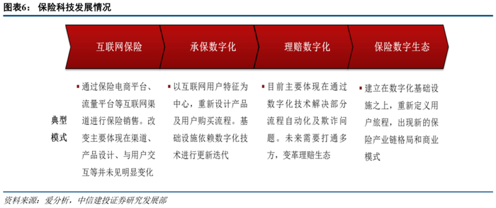 从科技技术对保险业务各个环节的赋能来看,云计算技术的运用能够帮助保险公司实现移动展业、移动理赔等,通过云计算对各类数据资源的整合,保险公司能够在客户营销、产品开发、风险定价、核保理赔等多个环节实现精准智能的业务运营,云计算是保险公司科技变革的重要基础设施;运用大数据技术可以建立更全面清晰的客户画像,有助于实现精准营销、交叉销售、个性化客户服务,还可以通过挖掘和分析不同场景的数据与用户行为,协助开发创新保险产品;人工智能主要运用于客户交互、以及核保、承保、理赔等环节,例如智能客服、智能保顾,以及通过人工智能,快速对客户提供资料真实性进行高效的识别和记录,以提高效率、减少人力成本、识别与控制风险;还有区块链、物联网、基因检测等技术在优化流程、风险控制、产品研发与定价等诸多方面的应用,都能够为保险公司切实带来效能的提升。科技技术的运用,为保险公司带来的效率提升、成本降低、风险控制、用户体验优化,均将成为公司运营与客户留存的核心竞争力。