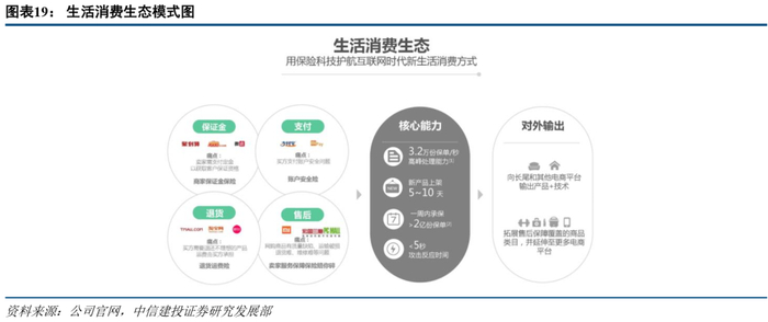这一部分业务主要为与主流电商平台(淘宝、天猫)等提供退货、产品质量、物流、售后服务、商家保证金等风险保障,在此领域占据市场头部地位。2019 年被保用户4.4亿人,人均保单16.5张,当期总保费37.294亿元,同比提升130.8%,主要受益于与蚂蚁金服的合作,并且进一步加深了多业务领域的合作,共同探索为用户提供创新的保险产品和用户体验。生活消费生态的赔付率为75.5%,由于高赔付率的退货险保费比重增加导致总体上升0.7pct.。但货运险渠道费用率较低,带动生态整体渠道费用率改善至18.2%,同比下降1.4个百分点。