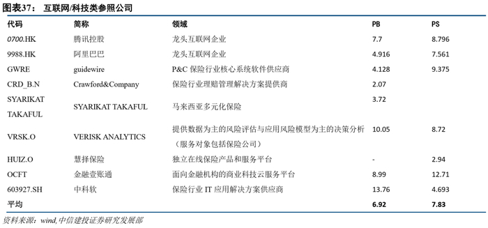 我们再按照互联网公司的估值逻辑来看,按照众安保险场景下的互联网公司定位,其场景和生态系统构建理念与互联网公司相似,我们选取腾讯和阿里巴巴两大互联网龙头公司,以及线上保险销售与服务平台慧择保险作为参照;其次,众安的科技板块业务理念又类似于保险行业IT技术与业务解决方案供应商,于是选取境内外上市的相关公司作为参照。参照公司平均PB估值为6.92倍,PS估值为7.83倍。由于众安在线销售收入主要来自于保费,而保险公司的PS估值倍数显著低于科技公司,用PS估值的话结果会明显偏高,这里我们还是主要看PB,考虑众安在成长阶段暂未实现盈利,以及结合保险业务估值逻辑,我们给予3倍的PB估值,目标价约为37.8港元,是目前股价的1.4倍,具备一定上涨空间。