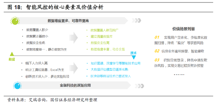 (3)大数据与风控模型助力风控升级。传统的风控方式主要依靠客户资产负债数据、人工对客户身份信息的匹配和查验,数据维度小且稳定性低,风控效果整体较弱。手机银行App经营则实现了多维度数据连接、数据间的动态交互验证,用户的特征更加精准化且能实时观测用户信息的变化,帮助机构精准排查潜在风险用户,大大提升了金融机构的风险控制效率。招商银行“天秤系统”30毫秒即可对疑似欺诈交易作出拦截判断,并未持卡人伪冒及盗用金额比例降低至千万分之八。平安银行打造的SAFE智能反欺诈体系2019年累计防堵欺诈损失超10亿元。