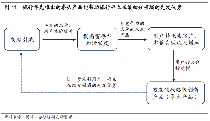 移动互联时代,市场上推出的金融产品虽然大多能快速被模仿,成熟期的产品功能一般大同小异,看似难以长期成为银行的核心竞争力。但具有前瞻性的首发产品则不然,好的首发产品能够凭借先发优势构筑护城河,同时,还可以优化场景,甚至创建新的场景,形成明显的正反馈效应。譬如,余额宝的推出改变了用户存钱的习惯,支付宝实现了从支付工具向财富管理工具的转变,余额宝是规模最大的货币市场基金。招商银行率先推出“一卡通”、“一网通”、“金葵花理财”、“私人银行”等优质产品,引领了中国零售银行业的转型。