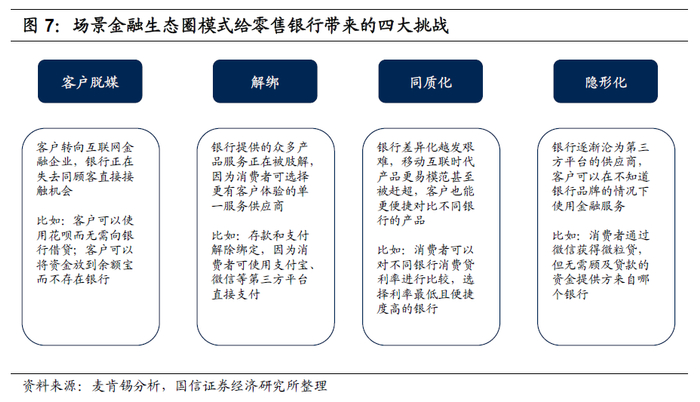 第一, 互联网金融企业构建的场景金融生态圈给传统零售银行带来巨大的挑战。场景金融生态圈中,场景已成为企业和用户构建连接关系的核心触点,用户不会主动想到一个金融服务,但会在场景中产生金融服务需求。缺乏高频生活的场景的银行面临客户脱媒、产品体系解绑、产品同质化以及逐步沦为第三方平台供应商等风险,因此,构建场景生态圈对零售银行转型至关重要。