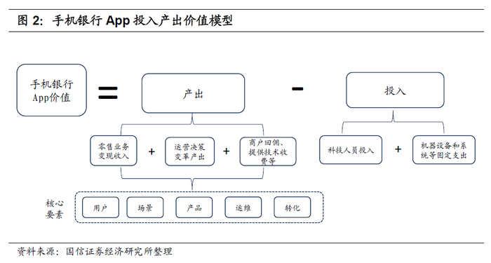 银行金融科技投入仍处于初始阶段,手机银行App经营并不成熟,对零售银行业务的带动效应还没有充分体现,加上各银行披露的App经营数据也较少,我们很难量化手机银行App投入产出价值。因此,此篇报告我们着重探讨手机银行App经营给零售银行带来了哪些变革,以及手机银行App布局的核心要素,以此来定性分析手机银行App的投入产出价值。