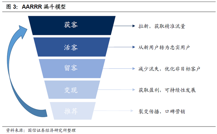 当前手机银行App最大痛点:高频生活场景缺失,客户黏度和活跃度低。在用户运营体系中,有一个经典的框架叫做AARRR,涵盖App生命周期的五个阶段:获取客户、提高活跃度、提高留存率、获取收入、自传播,最终形成一个用户漏斗分析模型,突出了增长的所有重要元素,且这些元素相互作用,相互联系。对于手机银行App来说,零售客户基础庞大,并且金融端有比较强的变现能力,但是由于金融场景属于低频场景,用户黏度和活跃度一直都比较低,这是移动互联时代手机银行App亟需解决的痛点。