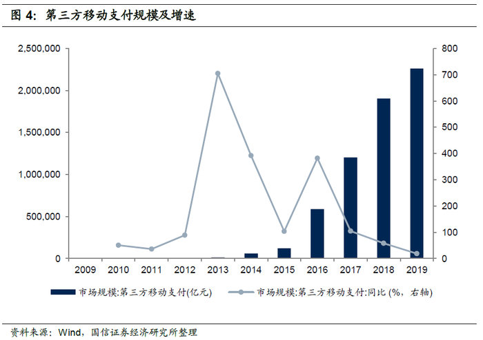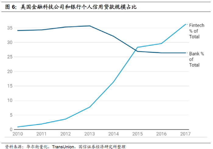互联网金融构建了“生活+金融”的生态模式,即将金融服务渗透进客户的生活场景中,培养了用户在特定场景下使用金融服务的习惯。阿里系、腾讯系等互联网企业巨头搭建了社交、电商、衣食住行、教育、娱乐、医疗等丰富的生活场景,由于生活场景具有用户黏性强、活跃度高的优势,互联网企业App拥有了庞大的高活跃度流量,掌握场景和流量的互联网平台逐步将业务范围渗透到金融服务领域,培养了用户在特定场景下使用金融服务的习惯,随着生态圈的扩展完善和聚合效应的出现,用户的忠诚度明显提高,互金业务增长迅猛,部分金融业务甚至被互联网企业颠覆,最明显的就是支付行业。2019年第三方移动支付行业规模达226万亿元,其中,支付宝依托淘宝(天猫)电商场景、财付通依托微信社交场景发展成为支付行业的两大巨头。除了支付行业,互联网金融企业还将金融服务衍生到消费贷、理财等领域,余额宝、花呗等产品规模快速增长。据TransUnion统计,美国高风险个人贷款领域金融科技企业的市场份额就已经超过了银行,从2012年到2017年,金融科技企业的高风险个人贷款市场份额从3%增加到35%以上,银行市场份额则从35%降到约26%。