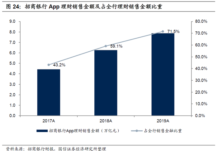 招商银行App理财销售金额比重持续提升。2018年招商银行App交易金额30.76万亿,同比增长72%,2019年交易金额为33.2万亿元,同比增长7.9%。其中,2019年招商银行App理财销售金额为7.87万亿元,同比增长25.7%,占全行理财投资销售金额的71.5%,同比增长12.4个百分点。