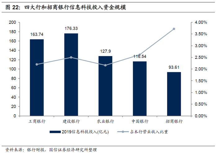 各银行纷纷加大金融科技资金投入,建设银行2019年信息科技投入176亿元,占本行营收总额的比重为2.50%,招商银行信息科技投入93.6亿元,同比增长44%,占公司营收总额的比重为3.72%。其中,2019年招商银行率先将金融科技投入比例写进公司章程,要求每年金融科技整体预算原则上不得少于本行上一年度营收的3.5%、其中“招行金融科技创新项目基金”预算额度原则上不低于上一年营收的1%。