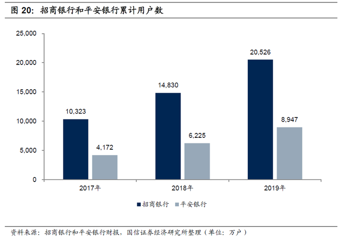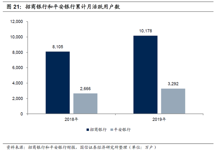 从金融科技发展较快的招商银行和平安银行来看,手机银行 App累计用户数和月活跃用户数均实现了较快增长:(1)从注册用户数来看,截止2019年末,招商银行两大App累计用户数(未去重)达2.05亿户,平安口袋银行App为 0.89亿户,同比分别增长38.4%和43.7%。(2)从月活跃用户来看,2019年招商银行两大App的MAU(未去重)达10178万户,平安口袋银行为3292万户,同比分别增长25.6%和23.5%。招商银行和平安银行月活用户率分别为49.6%和36.8%。