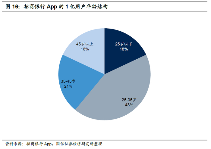第一,长尾客户脱媒使得银行高净值客户根基也不再牢固,手机银行App增强对长尾客户的吸引力。过去被银行忽视的长尾客户成为了互联网企业流量的主要来源,通过抢占各类线上线下场景和用户入口,互联网企业触达了越来越多的长尾用户,形成了聚沙成塔的效应,并通过小额高频的支付业务完成了场景金融生态圈的闭环改造。银行面临沦为产品供应商的风险,离客户尤其是年轻客户越来越远,若失去年轻客户一代,银行金字塔顶端的高净值客户的根基也将不再牢固,因此银行在服务好高净值客户的同时,也需要认识到海量长尾客户的价值。手机银行App对年轻一代吸引力增强,招商银行App的一亿用户里年龄在25岁以下的比重为18%,25-35岁的比重为43%。
