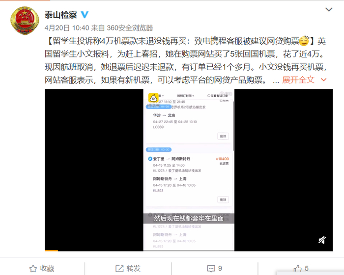 先后五次被退票,回国旅程没有成行,五次订票的预付款共计约4万元却始终未退还到小文的账户,而本欲第六次尝试订票的小文此时已耗尽现金,不得已的小文只得录制视频,通过媒体平台爆料投诉。