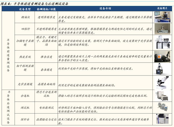 作为物理性检测的前道量检测设备,注重过程工艺监控。根据功能的不同又分为两种设备:一是量测类,二是缺陷检测类。(1)量测类设备:主要用来测量透明薄膜厚度、不透明薄膜厚度、膜应力、掺杂浓度、关键尺寸、套准精度等指标,对应的设备需求分别为椭偏仪、四探针、原子力显微镜、热波系统、扫描电子显微镜和相干探测显微镜等。(2)缺陷检测类设备:主要用来检测晶圆表面的缺陷,分为光学显微镜和扫描电子显微镜。