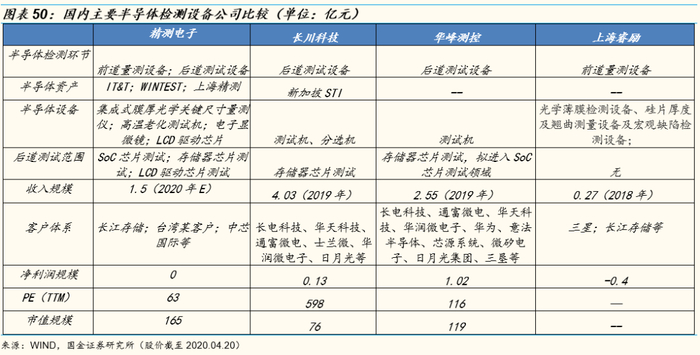 4家国产半导体检测设备企业的收入规模8.4亿元。其中精测电子2020年预计实现1.5亿元,华峰测控2019年收入2.55亿元,长川科技2019年收入4.03亿元,上海睿励2019年预计实现收入0.3亿元,目前半导体国产化率较低。