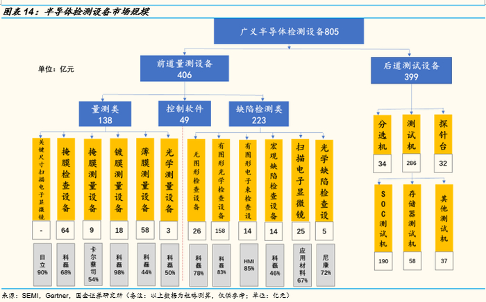 根据SEMI统计及我们的测算口径,全球半导体检测类设备市场规模超800亿,其中前道量测设备市场规模406亿元左右,后道测试设备399亿元左右。