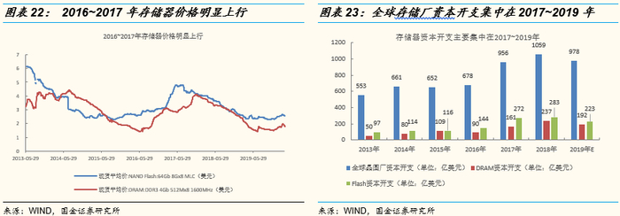 存储器是驱动2017~2019年行业资本开支的主要动力。2016H2~2017年,DRAM和NAND供不应求,出现大幅涨价,刺激了存储器厂商的资本开支,产能投放集中在2017~2019年。进入2020年,随着部分新增存储器产能的投放,DRAM和NAND价格回落到2016年水平。但是进入到2019年随着5G及其物联网技术的发展,各大存储器厂商加大对3D NAND堆叠技术的投入,继续引领资本开支增长。