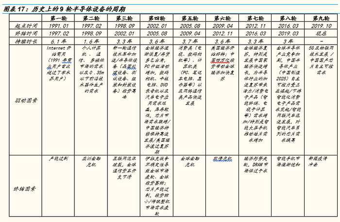 1991~2019年,全球半导体设备先后经历了9轮小周期,每一轮周期基本与全球经济的库存周期保持同步,持续时间在3.5年左右。对每一轮周期的复盘见下图。