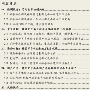 半导体检测设备国产化进度低于预期。目前半导体检测设备国产化程度较低,半导体前道量测设备领域,精测电子和上海睿励有实现个位数的订单突破;后道测试设备领域,长川科技和华峰测控在模拟芯片测试领域已经占据较高的份额,但是在SoC芯片测试和存储器芯片测试领域存在较大的空白。如果国产半导体检测设备厂商在产品开发、客户拓展方向不及预期,则国产化进度可能存在不及预期的风险。