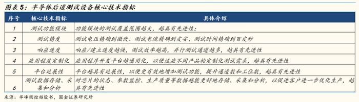 衡量半导体检测设备先进性的主要指标包括精度、速度、并测能力、自动化程度、平台延展性等指标。从技术指标来看,国内部分测试设备的产品已经逐渐接近国际领先水平。以测试机为例,目前的技术差异主要集中测试功能模块。