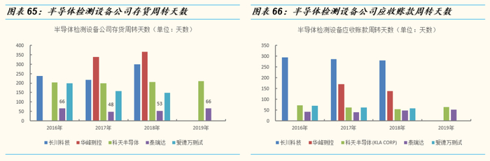 泰瑞达的存货周转天数明显低于其他竞争对手:泰瑞达存货周转天数在2个月左右,其他半导体检测设备公司存货周转天数都在200天以上,华峰测控的存货周转天数最高,接近一年的时间;海外的半导体检测设备公司应收账款周转天数在2个月左右,国内的半导体检测设备公司应收账款周转天数较高,其中长川科技高达300天,华峰测控5-6个月。