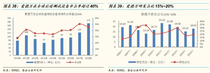 市场份额:公司在全球后道测试设备领域的份额长期稳定在30%-40%,超过泰瑞达,位列全球第一。公司的市场份额经历了2004年、2011年两个明显提升市场份额的时期。