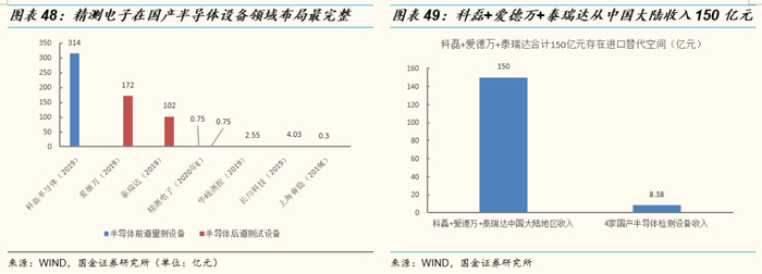 科磊半导体、爱德万、泰瑞达三家在中国区合计有150亿元人民币收入规模。以精测电子、华峰测控、长川科技和上海睿励为代表的国产半导体检测设备企业奋起直追,在模拟芯片测试领域已经占据较高的份额,但是在半导体前道量测和后道SoC芯片和存储芯片测试设备领域国产化程度并不高,进口替代需求强烈。