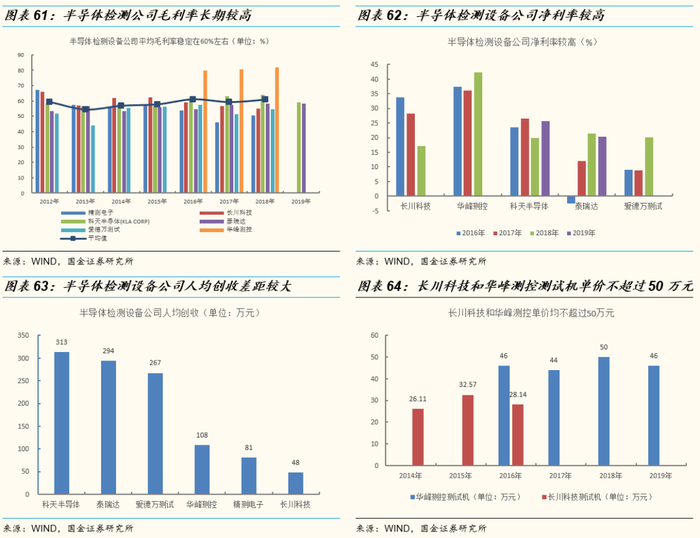 海外半导体检测设备公司人均产出较高。科天半导体、爱德万、泰瑞达公司人均产出接近300万元,因此其单品价值量较高。华峰测控和长川科技人均产出较低,主要是因为其产品单价较低,不超过50万元。