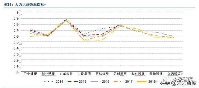 人力资源是医疗信息化企业最重要的资源,人力运营效率是影响企业竞争力重要因素。设定指标=(人均收 入-人均薪酬)/人均收入,指标越高则表明人力运营效率越高。依据 2018 年数据,东华软件,思创医惠以及和仁科技人力运营效率较高,而万达信息和东软集团人力运营效率偏低。