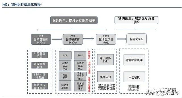 财政投入与医保政策刺激医疗信息化从医院管理信息系统(HIS)跨越到医院临床信息系统(CIS)。HIS 以财务管理为核心,支持医院的行政管理和事务处理。CIS 包含电子病历系统(EMR),医学影像系统(PACS),实验室信息管理系统(LIS)等,着眼于支持医院医护人员的临床活动。2003 年前后,SARS 刺激财政医疗投入,叠加全国医保、新农合开始实施推动医院临床信息系统(CIS)发展。