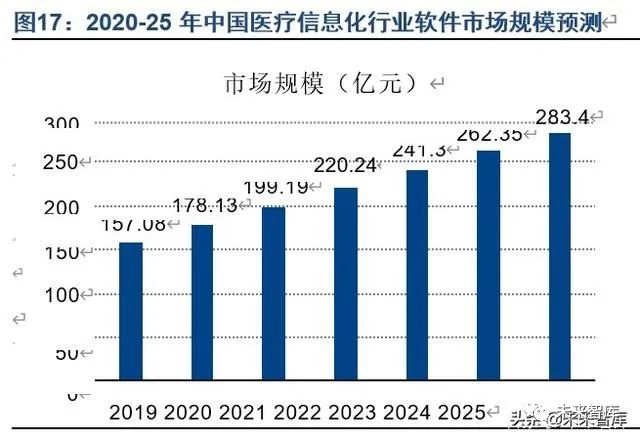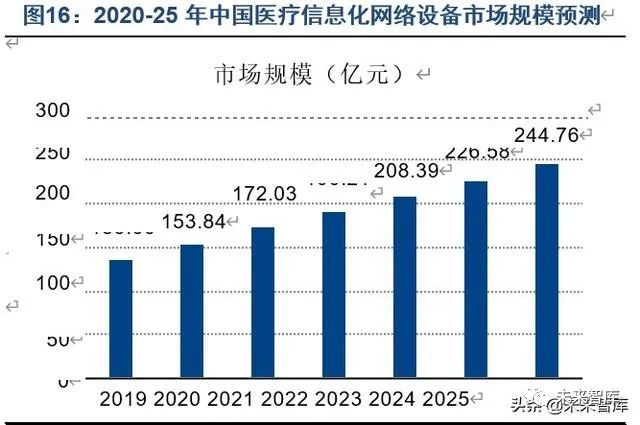 中国医疗信息化市场可以分拆为四个部分:硬件市场,信息化网络设备市场,软件市场,以及服务市场。预计硬件市场 2025 年达到 541.04 亿元;网络设备市场 2025 年达到 244.76 亿元;软件市场 2025 年达到 283.4亿元;服务市场 2025 年达到 218.99 亿元。