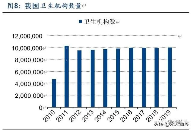 第三,各级医院及医疗机构自身提升效率的需要。我国各级医院 2019 年达到了 30 多万所,各级卫生机构达到 1000 万的数量,如此庞大的医疗卫生机构数量将是一个很大的市场,需要很长时间消化。
