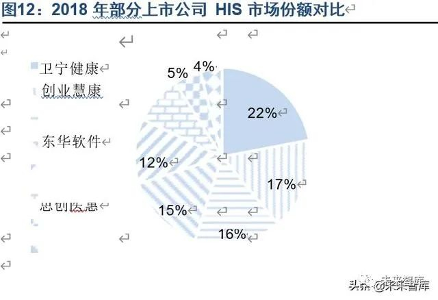 上市公司细分市场集中度较高,发展形势相对明确。HIS 市场即院内市场由卫宁健康,创业慧康,东软集团, 东华软件和和仁科技占据前 5,占比 82%较为集中。非 HIS 市场,万达信息占据了 39%的市场份额,创业慧康和卫宁健康占据 17%的份额,东软集团占据 12%,Top4 达到了 85%。行业领军者如卫宁健康等在 HIS, 非 HIS 市场的优势都较为明显。