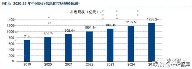 目前我国正处于医疗信息化 CIS 阶段,预计 2020 年医疗信息化市场规模将接近 809.7 亿元。预计 2020-2025年中国医疗信息化市场规模 CAGR 为 9.73%,到 2025 年中国医疗信息化市场规模将达到 1288.2 亿元.