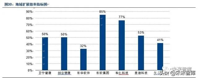 地域扩展效率通过考察企业所在区域之外的收入占总收入的比重,来判断企业打破地域限制开拓业务的能力。 医疗信息化建设由于需要有配套硬件,因此地域限制十分明显,而打破地域限制对于企业壮大必不可少。因 此把地域划分成华东,华北,西南等若干区域,设定指标=企业所属区域之外的收入/企业总收入。