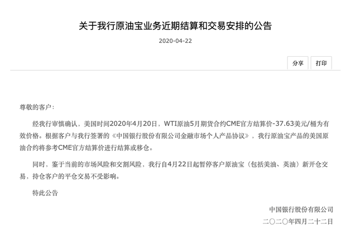 4月22日,中国银行表示,经我行审慎确认,美国时间2020年4月20日,WTI原油5月期货合约CME官方结算价-37.63美元/桶为有效价格。根据客户与我行签署的《中国银行股份有限公司金融市场个人产品协议》,我行原油宝产品的美国原油合约将参考CME官方结算价进行结算或移仓。同时,鉴于当前的市场风险和交割风险,中国银行自4月22日起暂停客户原油宝(包括美油、英油)新开仓交易,持仓客户的平仓交易不受影响。