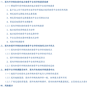 以穆迪评级为代表的国外评级机构的侧重点:(1)对于各要素对应级别调整规定明确;(2)会考虑当地国企规模以及国企对当地政府的重要性,是否能对受困平台有所救助;(3)会较为关注当地的金融环境、金融机构救助能力;(4)考虑平台公司可能被当作政府受困或其他平台受困时救助工具的风险;(5)在考察平台自身水平时考虑了平台其他商业类业务的敞口风险影响。
