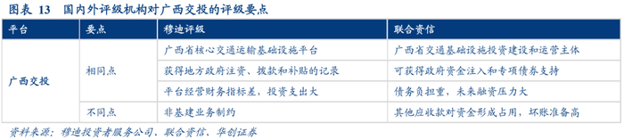 (2)关注城投平台的地位,获得政府支持的历史记录,以及平台的资本支出和再融资压力。穆迪评级分析了广西交投作为广西省核心交通运输基础设施平台,公司地位重要,曾获得过稳定的支付支持补助,关注城投平台获得地方政府注资、拨款和补贴的记录。但提示其业务经营指标一般,未来投资支出压力大,非主营业务对公司发展有一定制约,财务指标疲弱、资本支出需求庞大以及非基建业务相关挑战的制约。