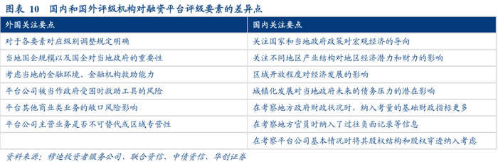 通过对比国内外评级机构对城投平台的评级要素,主要有以下四点差异: