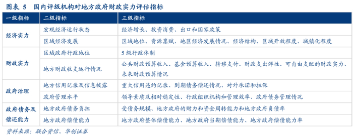 (4)以联合资信和中债资信为代表的国内评级机构,根植于国内企业的信用评级,对于国家和地方政策的关注度更高。对地方财政状况的考察面更广,以及过往的地方官员有无相关负面记录等因素。此外,国内机构将地方区域开放程度和城镇化发展对未来政府债务压力趋势纳入考察体系。
