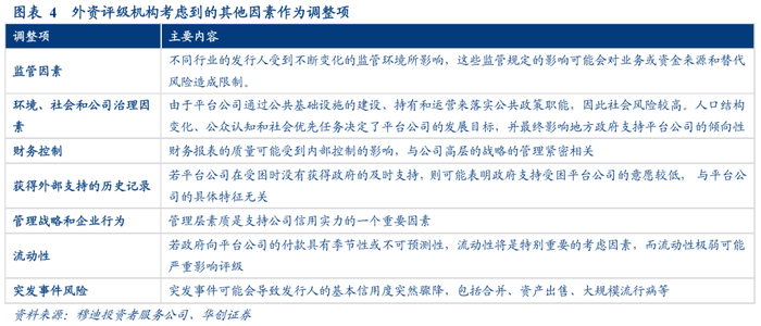 平台公司所处行业不同,一些评价指标在不同发行人之间差异很大,因此需要将这些指标特殊考虑,作为调整项纳入评级体系。此类因素包括财务控制和财务报告质量、获得支持的记录、管理层素质和经验、公司治理评估及环境和社会考虑因素、监管环境和标准、流动性。