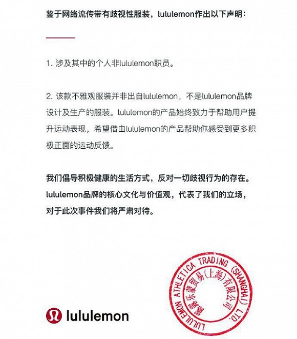 当天下午,针对此事,该品牌在微信公众号等官方账号上发布紧急澄清声明,再次强调涉事人员不是公司员工,同时指出,这件衣服并非lululemon设计或生产的服装。