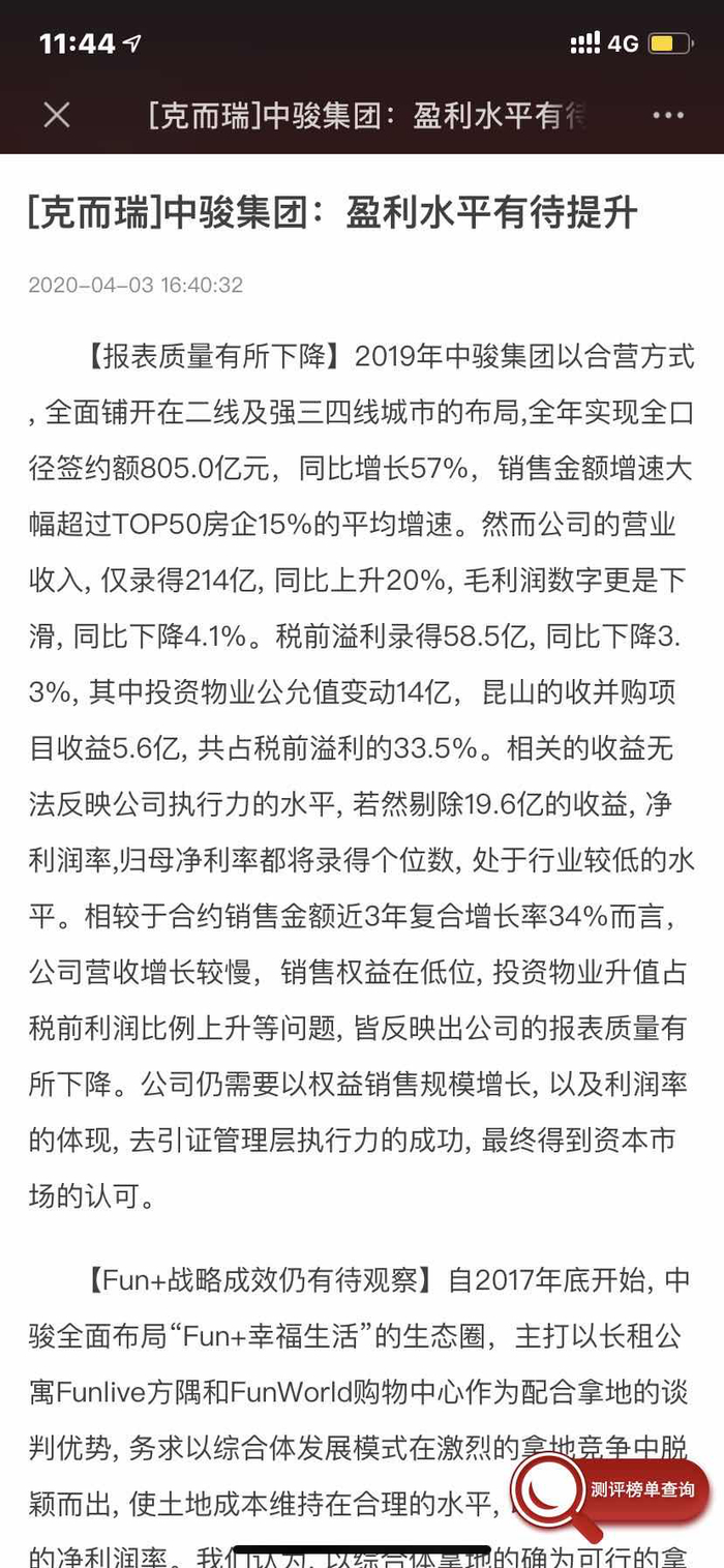 据克而瑞“2019年1-12月房企销售榜T0P200”显示,中骏集团2019年的权益销售额仅为435.6亿元,即在中骏集团805亿元全口径销售额里,有45.8%是合营及联营方贡献的;克而瑞报告认为,中骏集团相关的收益无法反映公司执行力的水平, 若然剔除19.6亿元的收益, 净利润率,归母净利率都将录得个位数, 处于行业较低的水平。相较于合约销售金额近3年复合增长率34%而言,受中骏合联营项目较多,并表项目较少所致,中骏集团营收增长较慢,销售权益在低位, 投资物业升值占税前利润比例上升等问题, 皆反映出公司的报表质量有所下降。