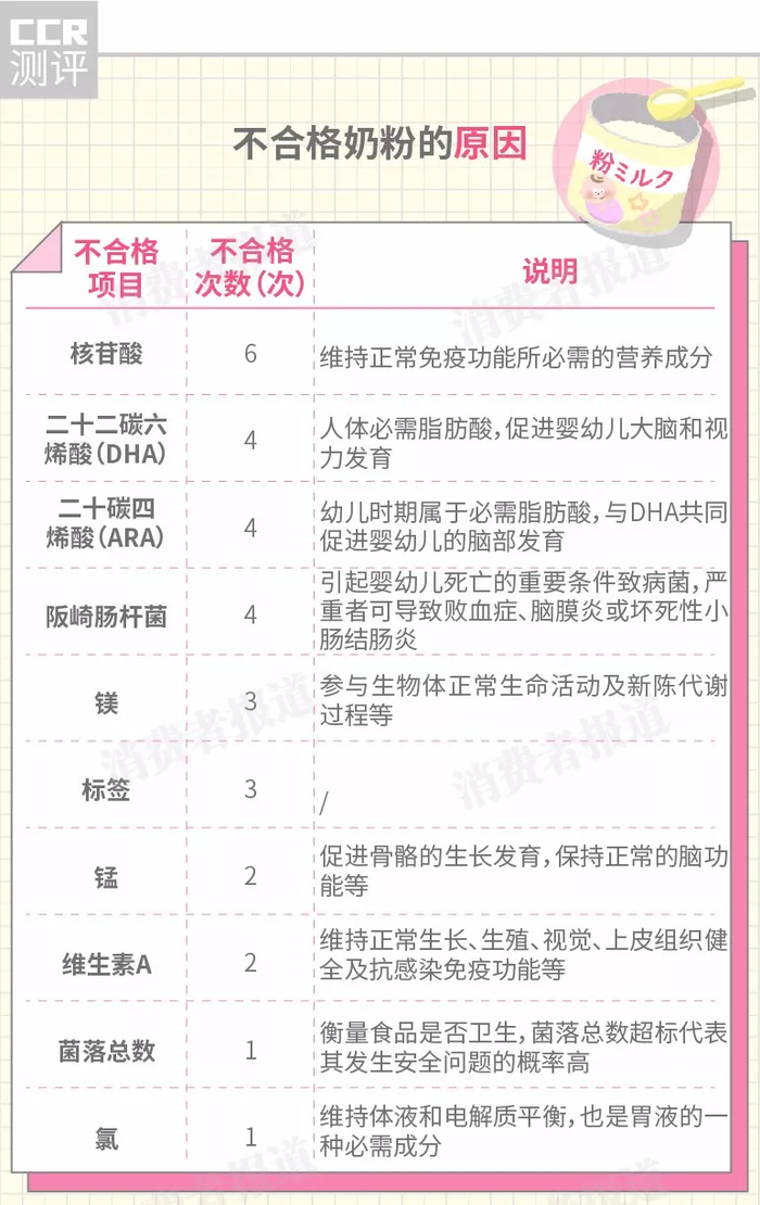 抽检结果显示,核苷酸不合格次数最多,为6次,其次为二十二碳六烯酸(DHA)、二十碳四烯酸(ARA)、阪崎肠杆菌,均为4次。